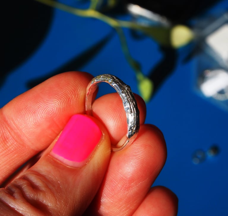 The ring has been made by casting a piece of tree bark. The technique produces a gnarly texture that is really lovely to wear as a piece of jewellery.