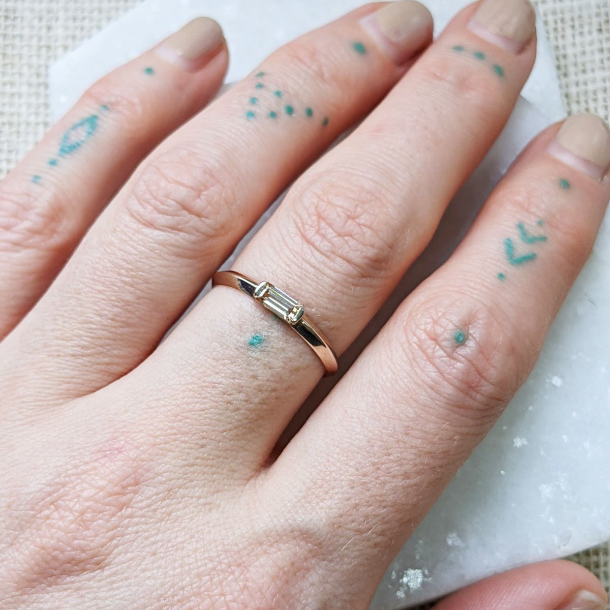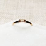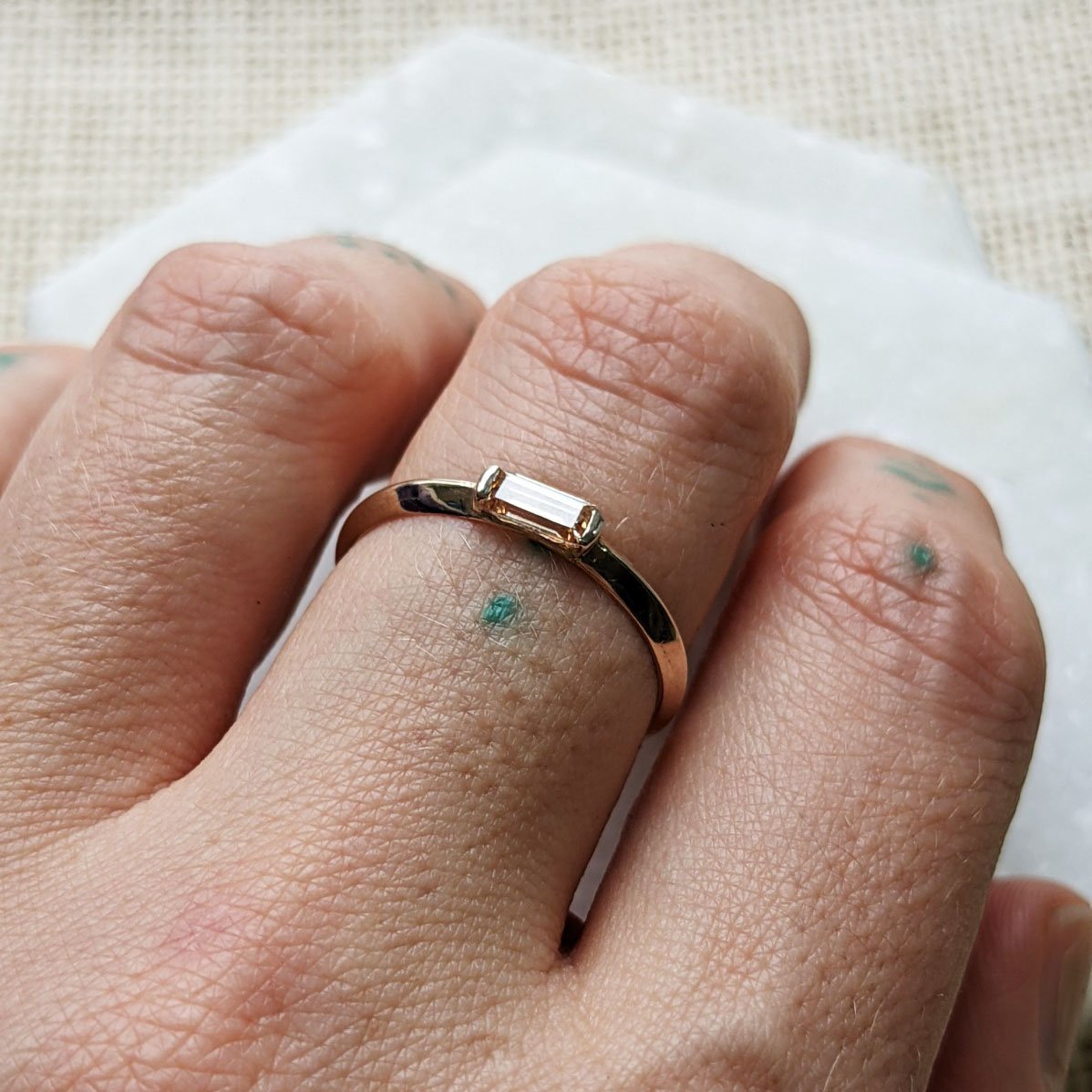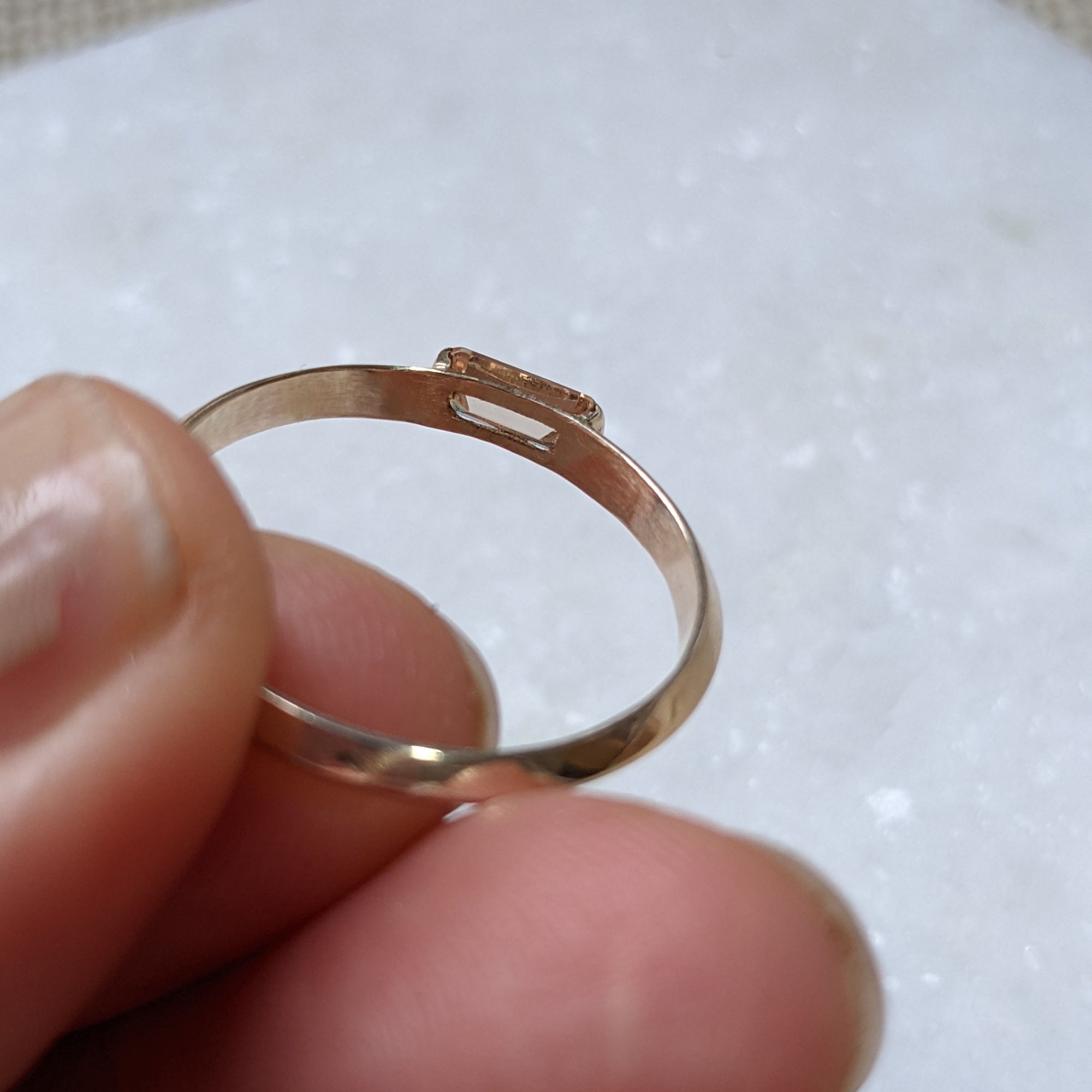 This is a grogeous hand made ring crafted from solid 9ct recycled gold. It is set with stunning soft champaign baguette stone that sparkles beautifully in the light.