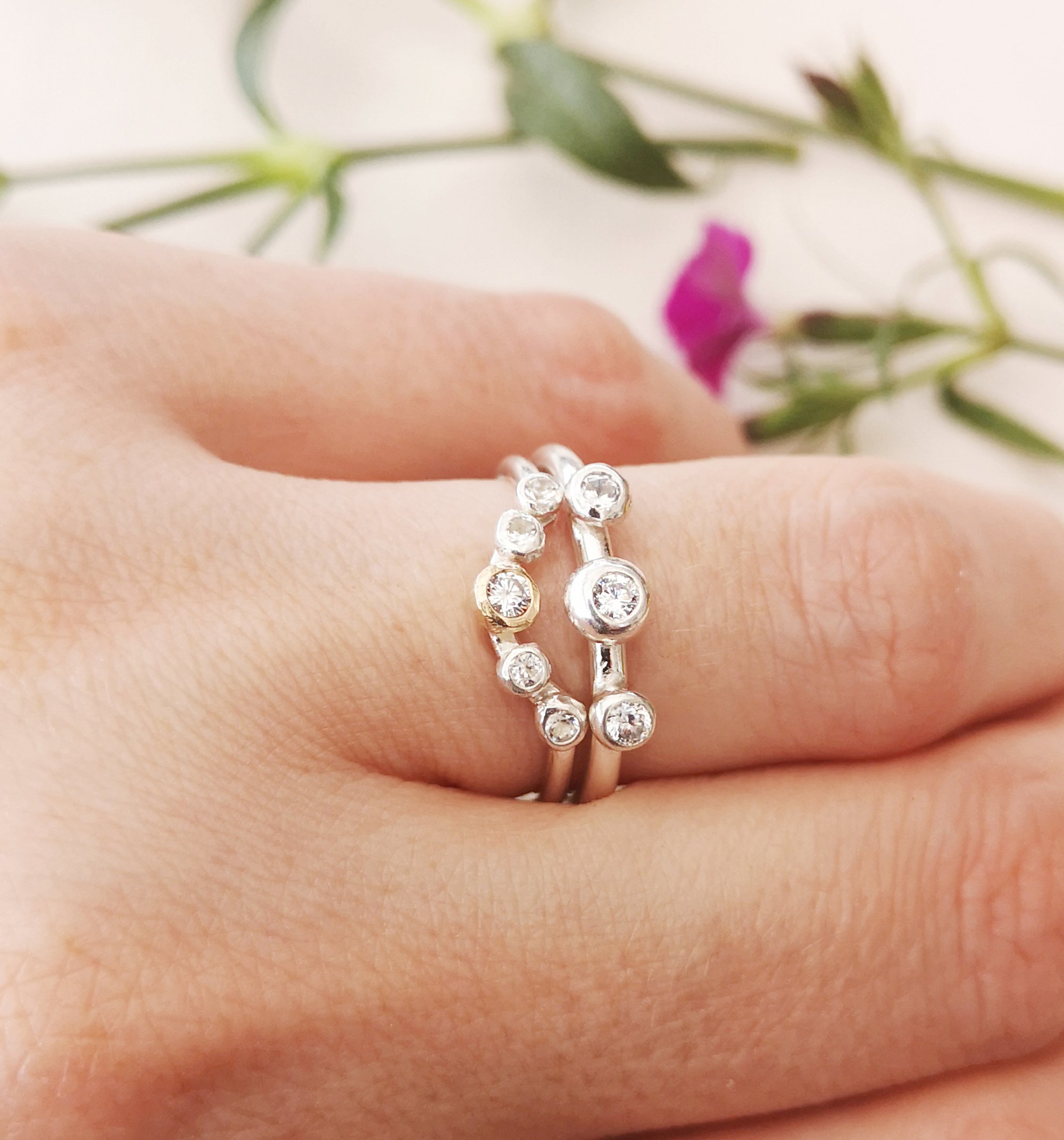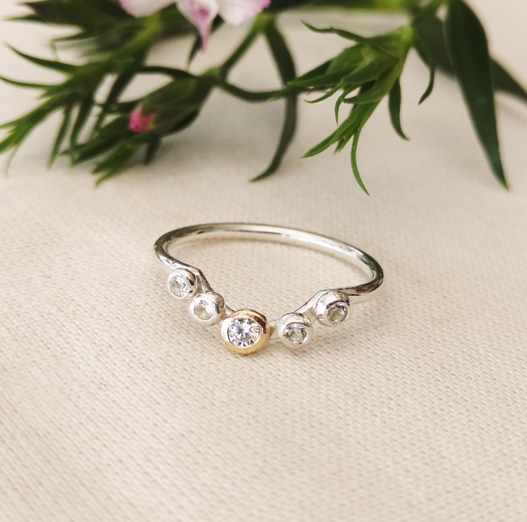 It has four 2.5mm cubic zirconia stones set delicately in silver and one 4.5mm stone set in solid 9ct gold.