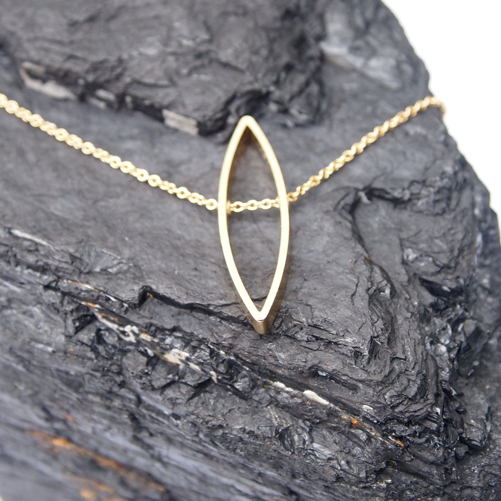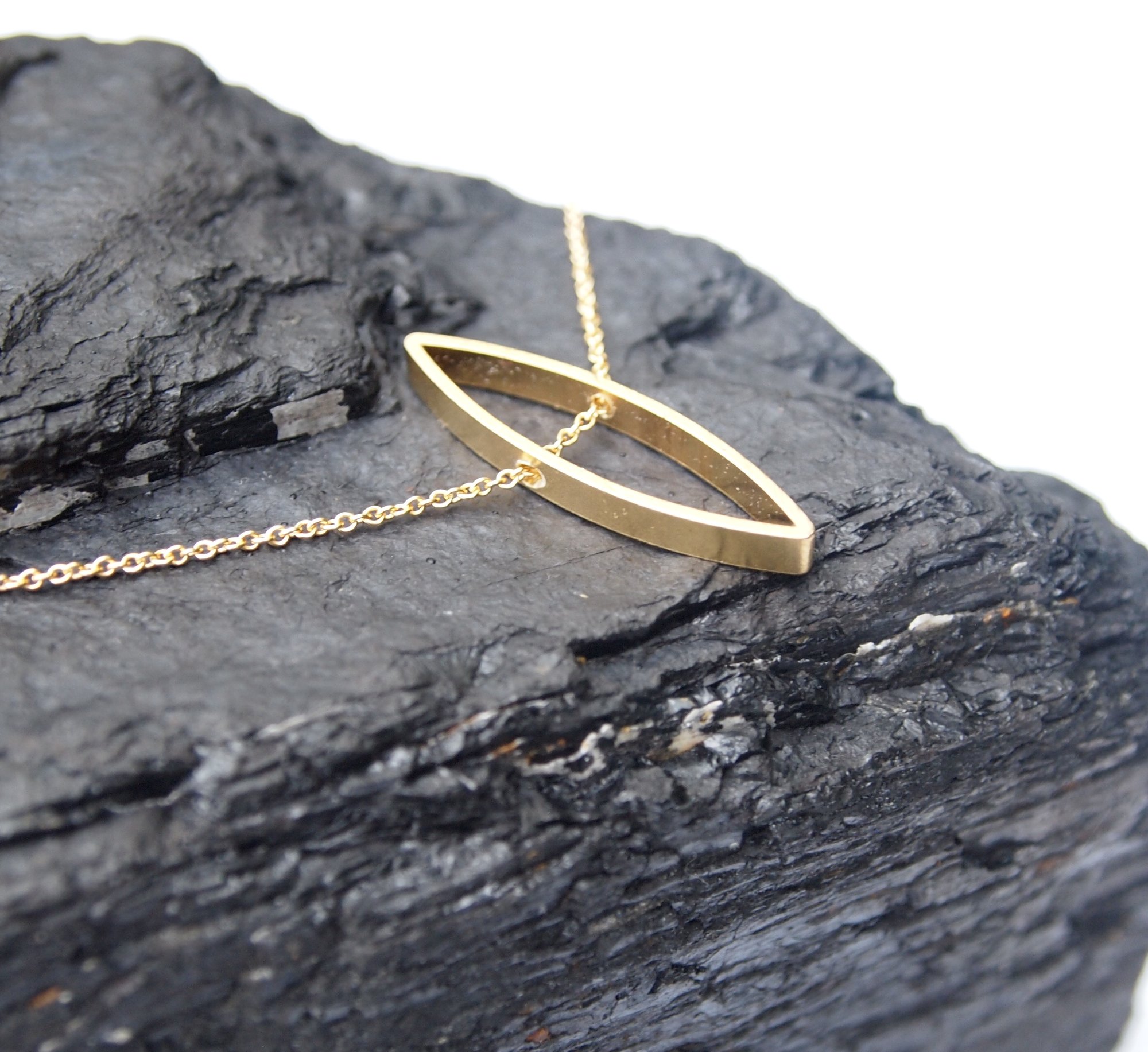 a geometric brass linear pendant with an 18 inch gold filled trace chain.