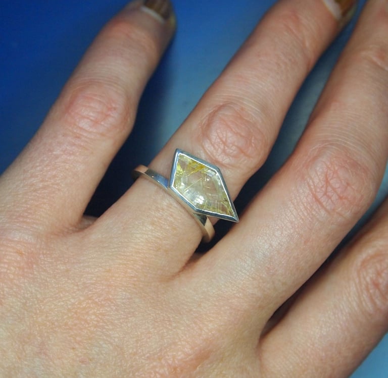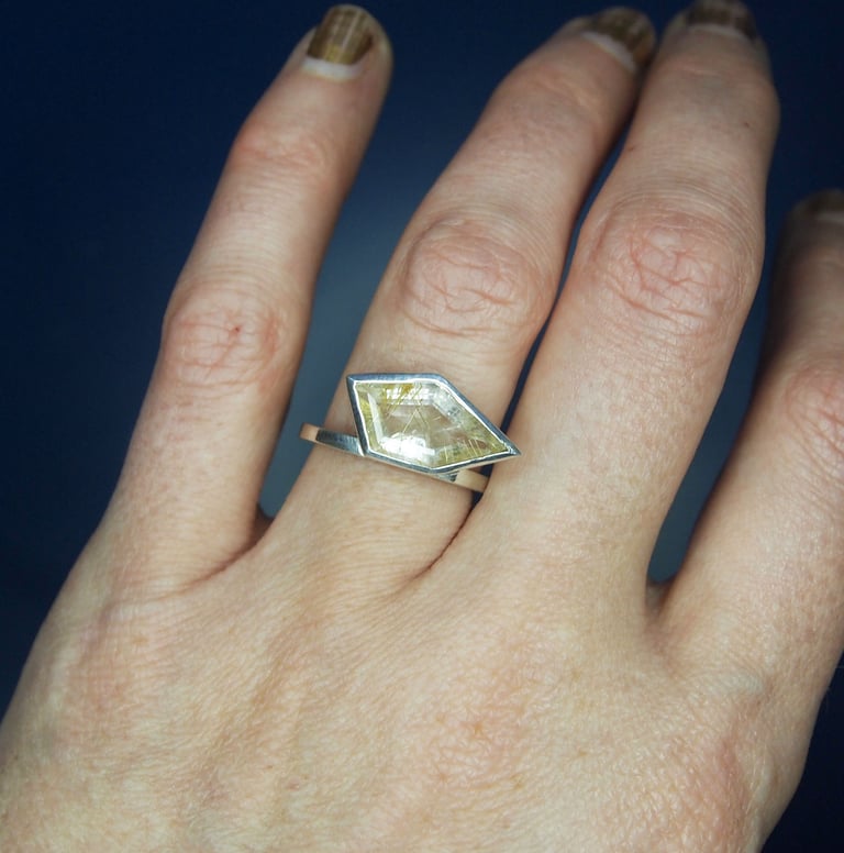 This ring holds a stunning free form rutilated quartz. It was mined and cut at a small family run mine in Brazil. It has a beautiful golden glow with fantastic acicular (needle-like) inclusions running through it.