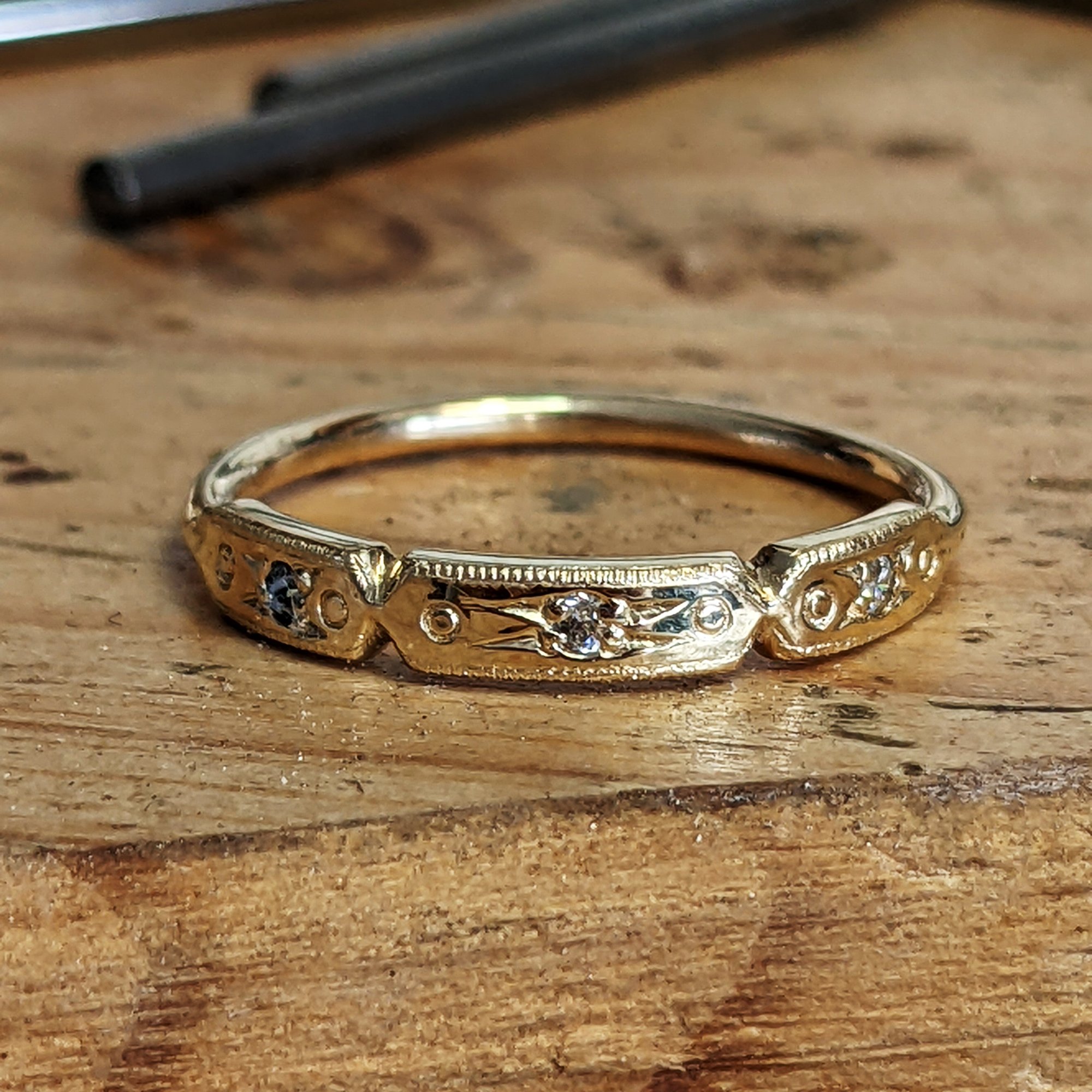 It has a 1.5mm shank with a 3mm wide band at the front that holds three 1.5mm salt and pepper diamonds. The band is then decorated with hand engravings and the edges are milled to give it extra sparkle.
