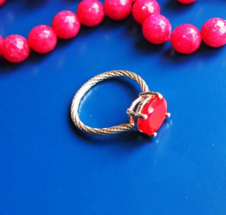 Made from a sparkly faceted rope the Mandorla ring is a lovely cocktail ring that sparkles with its pink gawa agate stone.