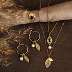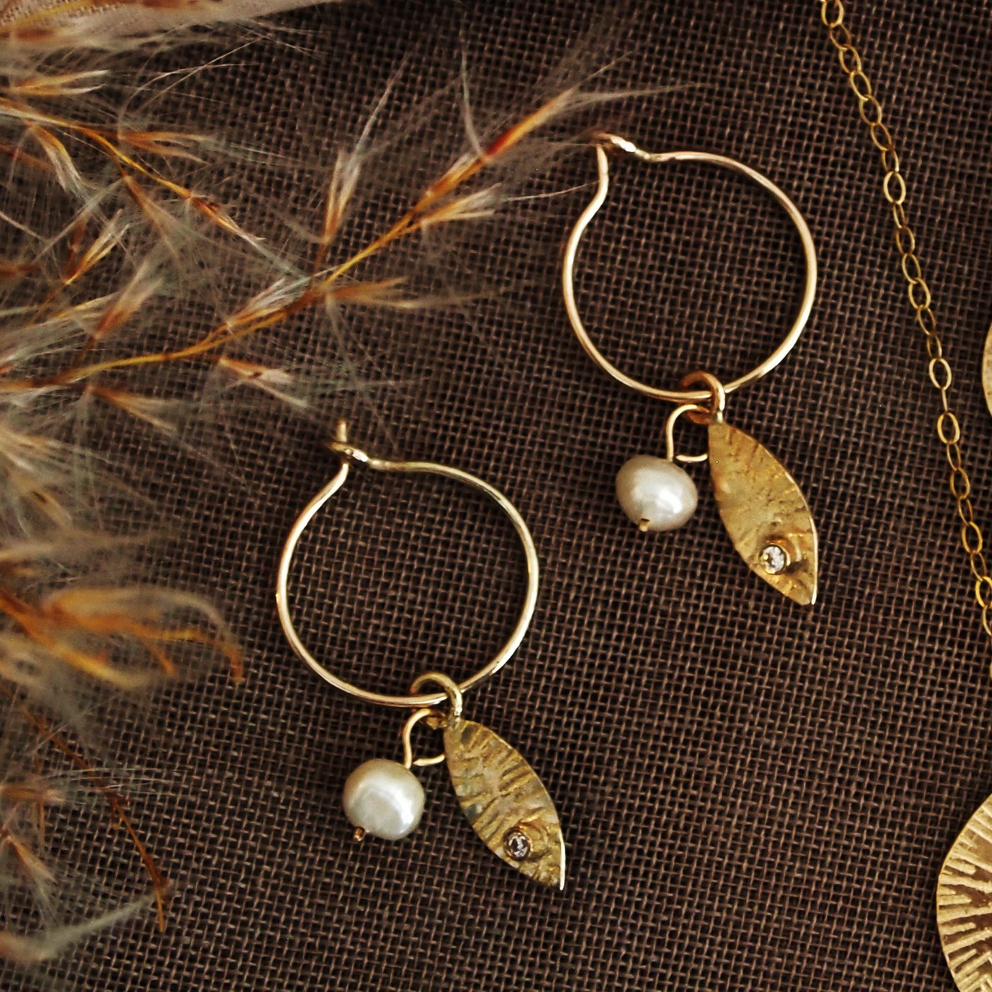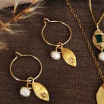 9ct eco gold almond, fresh water pearl and diamond hoop earrings.