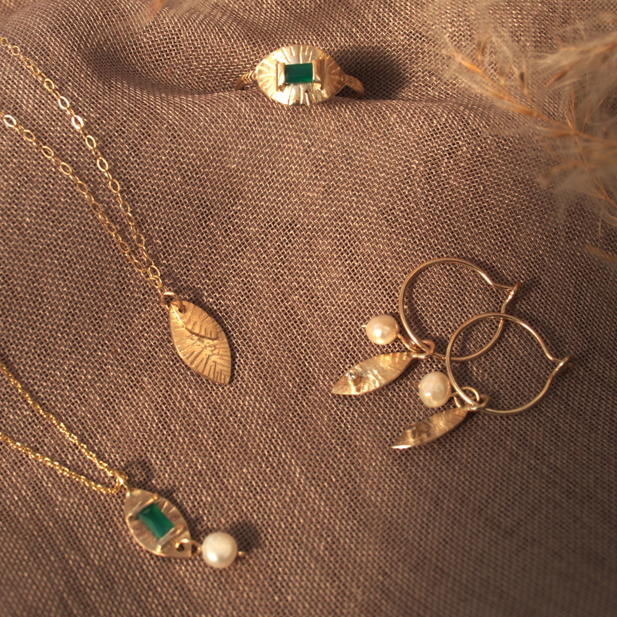 The lovely Maya necklette is made from 9ct eco gold, it has two delecate almond shapes that are hand decorated with patterns influenced from ancient times.