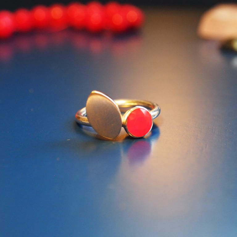 This ring is adorned with the most beautiful coloured pink gawa stone and the most tactile 3D lense shape. It is all hand made in a jewellery workshop just north of dundee.